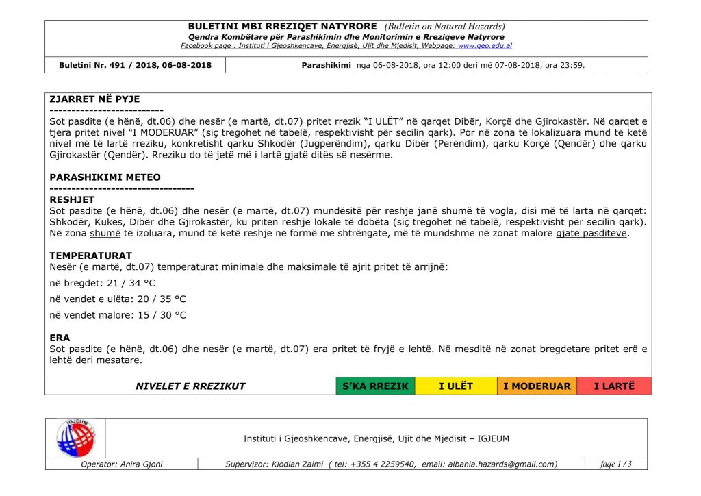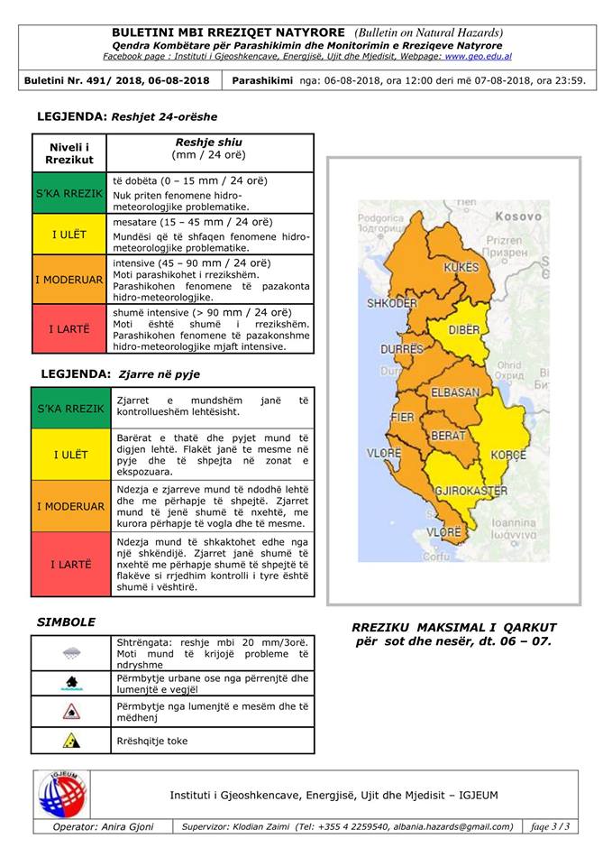 “Sot pasdite (e hënë, dt.06) dhe nesër (e martë, dt.07) pritet rrezik “I ULËT” në qarqet Dibër, Korçë dhe Gjirokastër. Në qarqet e tjera pritet nivel “I MODERUAR” (siç tregohet në tabelë, respektivisht për secilin qark). Por në zona të lokalizuara mund të ketë nivel më të lartë rreziku, konkretisht qarku Shkodër (Jugperëndim), qarku Dibër (Perëndim), qarku Korçë (Qendër) dhe qarku Gjirokastër (Qendër). Rreziku do tё jetё mё i lartё gjatë ditës sё nesërme”,thotë IGJEUM.