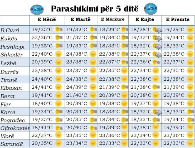Vala e të nxehtit, do të jetë e pranishme më së shumti në fillim të kësaj jave. Zonat perëndimore do të vijojnë të mbeten me temperatura të larta edhe pse parashikohen luhatjet si në tabelë.
