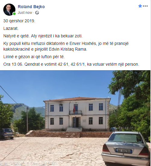 Ish-kryetari i PD Gjirokastër, Roland Bejko, ndodhet në Lazarat për të vëzhguar procesin zgjedhor. Përmes një postimi në Facebook, ai tregon një qendër votimi ku ka votuar vetëm një person. Deri më tani në Lazarat kanë votuar rreth 60 persona. PD ishte përgatitur për akte dhune në 30 qershor, por ultimatumi amerikan bëri që opozita të ndryshonte qëndrim totalisht. Nuk raportohen incidente në Gjirokastër. Situata është e qetë dhe pjesëmarrja në votime vlerësohet diku mbi 25%.