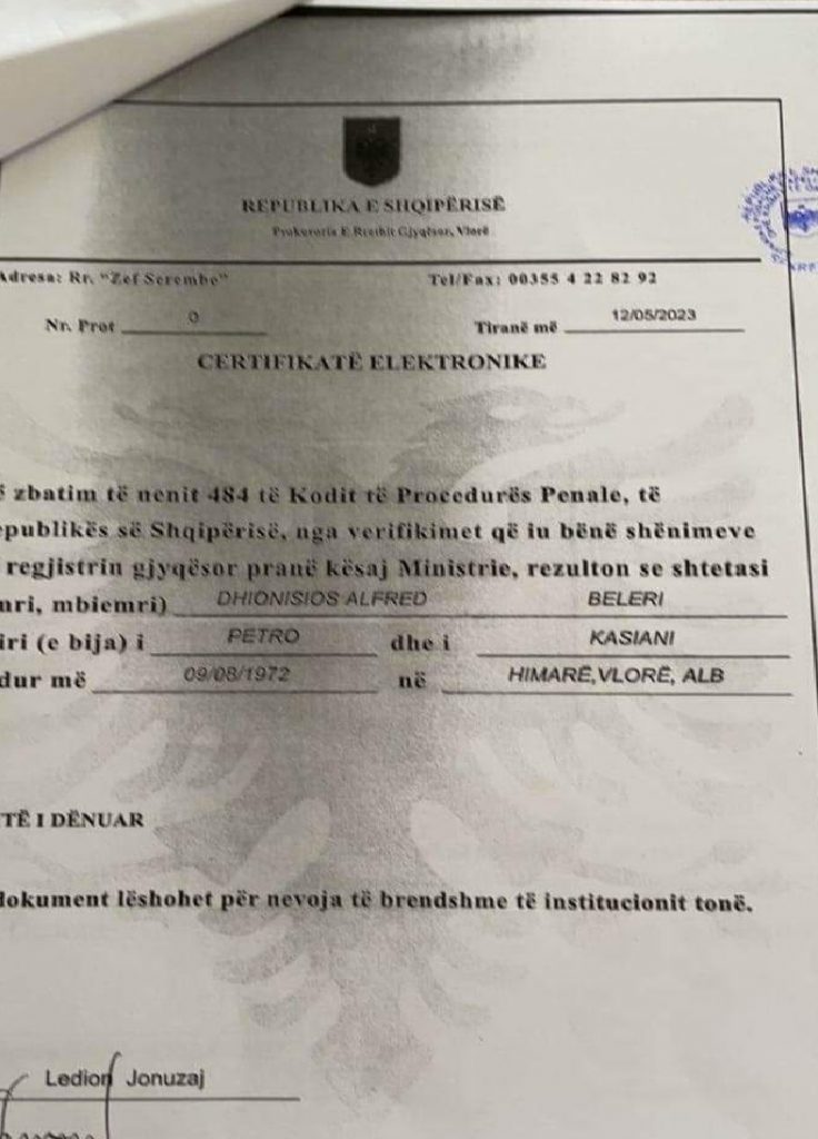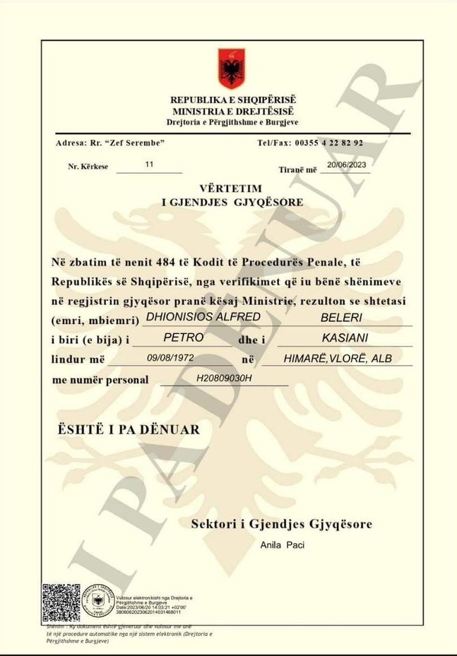 Manjani gjithashtu ka evidentuar se paraburgimi i Belerit po sajohet me dëshmi penaliteti fallco. Në fakt, dëshmia e penalitetit që i referohet Manjani, i majit 2023 e nxjerr Belerin të dënuar, ndërkohë që nga një verifikim i thjeshtë në e- albania, rezulton krejt ndryshe. (fotot poshtë)