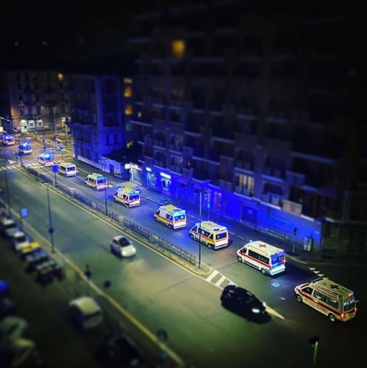 Në Torino, një foto e publikuar në Instagram portretizon kolonën e ambulancave me sirenat e fikura që kthehen rreth orës 10 të mbrëmjes në Corso Dante në fund të shërbimit të tyre, ndërsa në Foggia një linjë e gjatë e automjeteve të urgjencës po pret përpara spitalit.