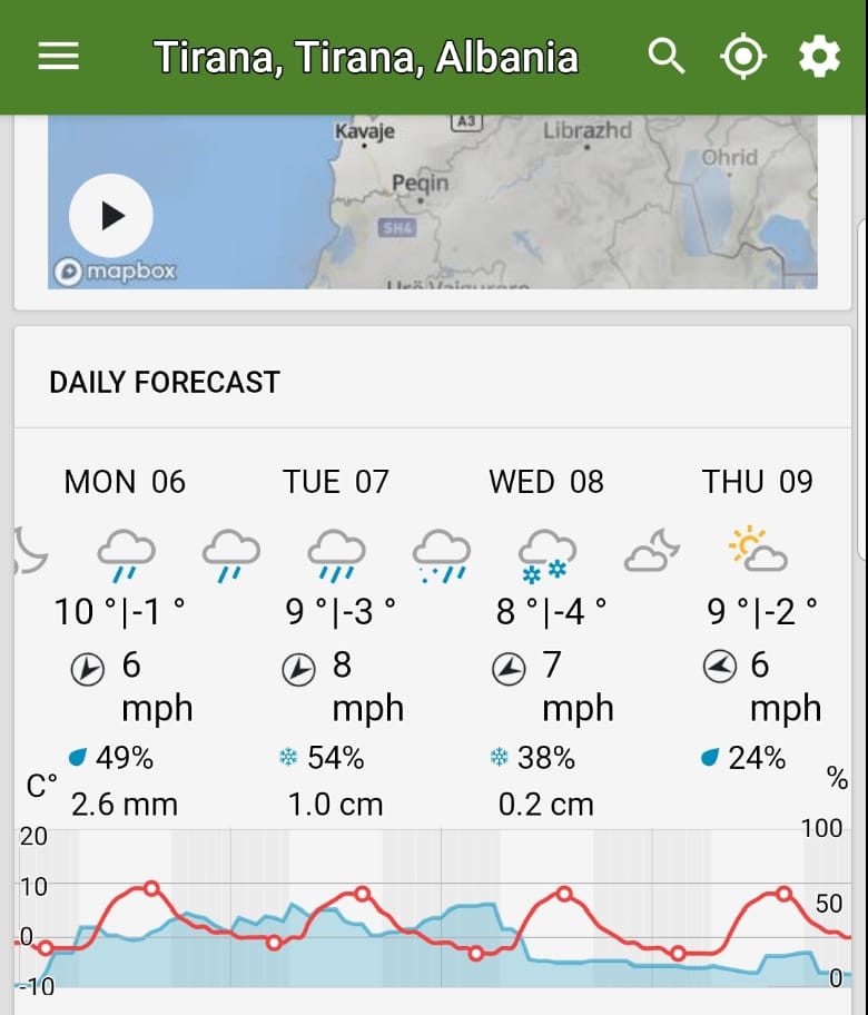 Sipas parashikimit të motit, në Tiranë reshje bore pritet të ketë më 7 dhe 8 shkurt. Megjithatë, mos prisni që të bëhet si në Dardhë e Valbonë, pasi intesiteti i reshjeve do të jetë i vogël dhe afatshkurtër.