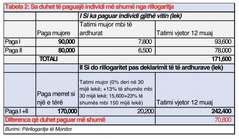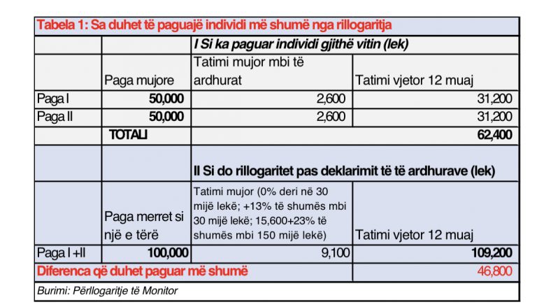 Një individ që ka dy paga mujore nga 50 mijë lekë, aktualisht paguan në vit si tatim mbi të ardhurat 62,400 lekë në total (për të dy pagat, llogaritet vetëm 13% e shumës mbi 30 mijë lekë). Në fillim të vitit të ardhshëm të vitit, kur të bëhet deklarimi i të ardhurave dhe rillogaritja, ai do të duhet të paguajë shtesë në total edhe 46,800 lekë (pasi tatimi do të llogaritet mbi një pagë të vetme prej 100 mijë lekësh dhe do të rezultonte në total 109,200 lekë për gjithë vitin). Shuma e paguar do të rritet në këtë rast me 42% (shiko tabelën 1).