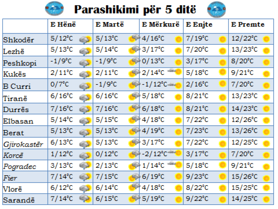 Për tu theksuar vetëm janë temperaturat (sidomos të ditës së Enjte dhe asaj të Premte) ku vlerat e mesditës do të na rikthejnë ndjesinë e ditëve të verës!!!