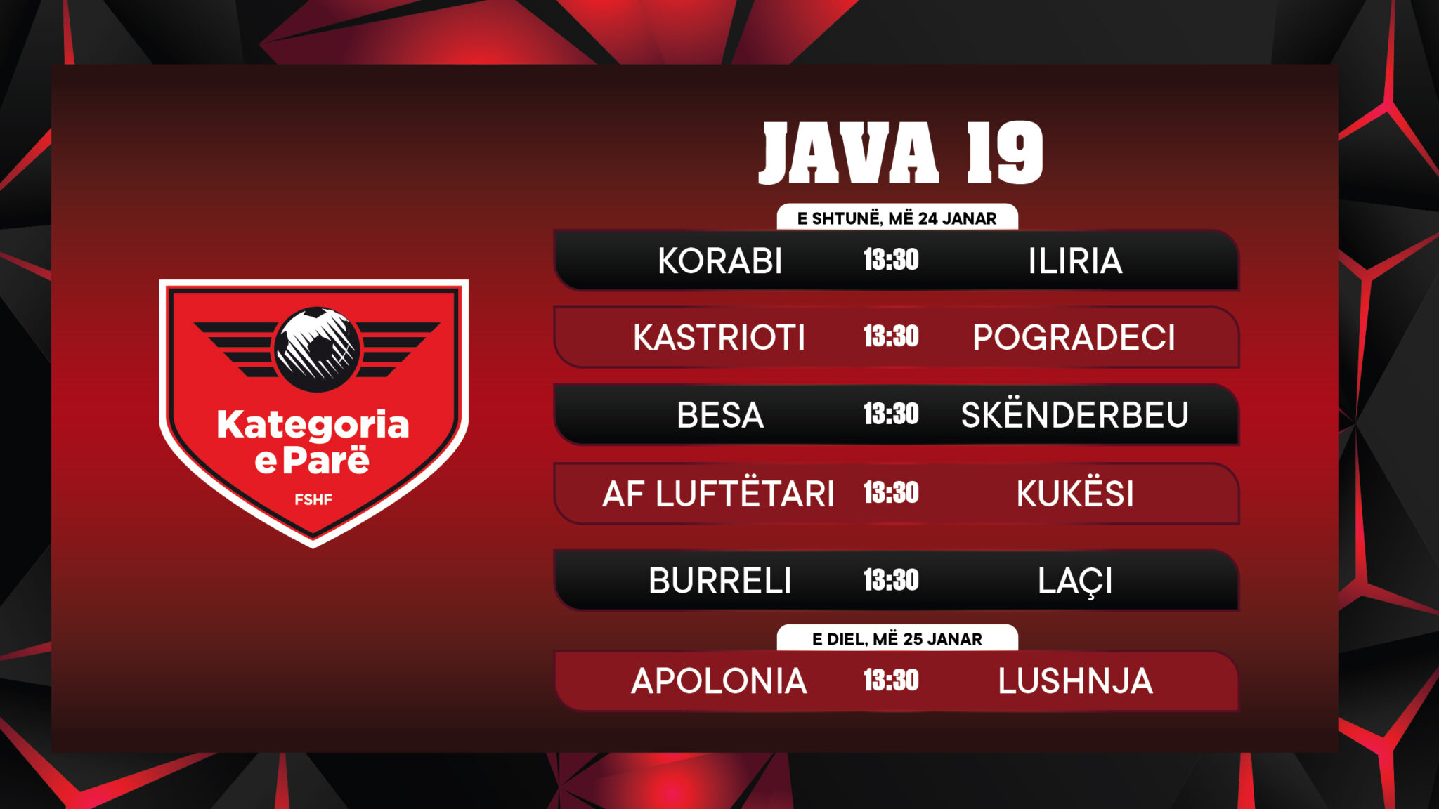 Java e 19-të e Kategorisë së Parë zhvillohet këtë fundjavë, më 24 dhe 25 janar. Pesë ndeshje do të luhen të shtunën nga ora 13:30 dhe një takim të dielën.