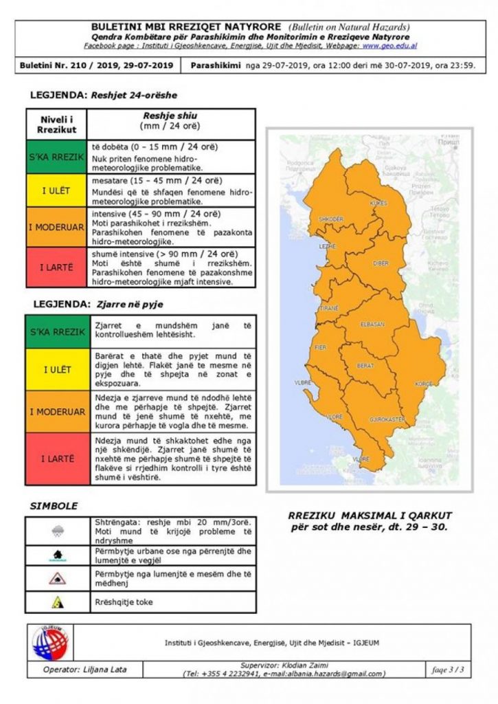 Sipas Instituti i Gjeoshkencave, Energjisë, Ujit dhe Mjedisit, ditën e sotme reshjet e shiut do të jenë më të shumta në pjesën veriore të Shqipërisë.