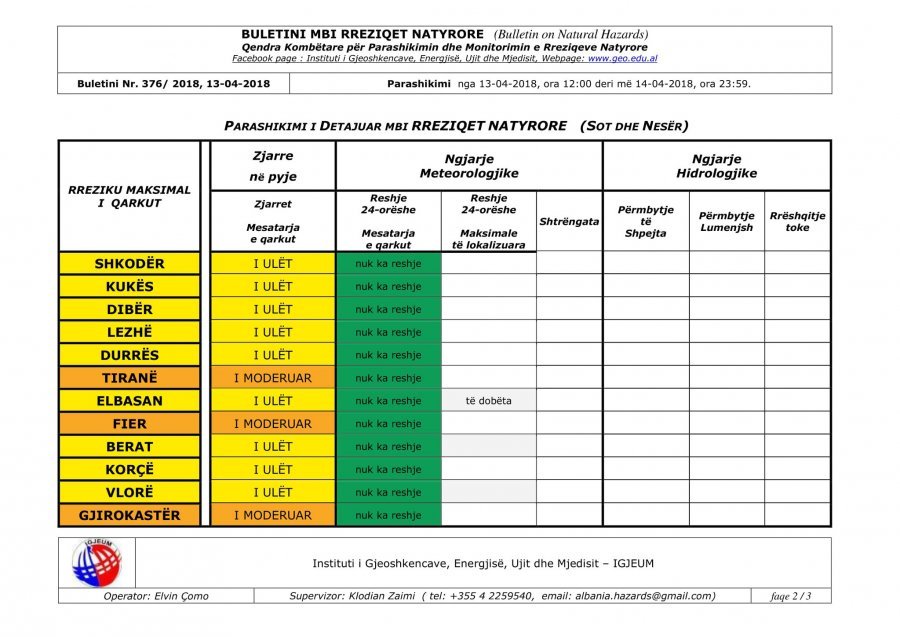 Sot pasdite (e premte, dt.13) dhe nesër (e shtunë, dt.14) pritet nivel rreziku “I MODERUAR” në qarqet Tiranë, Fier dhe Gjirokastër. Pjesa tjetër e territorit do të ngelet në nivelin “I ULËT” (siç tregohet në tabelë, respektivisht për secilin qark). Rreziku pritet të jetë më i lartë gjatë ditës së nesërme.