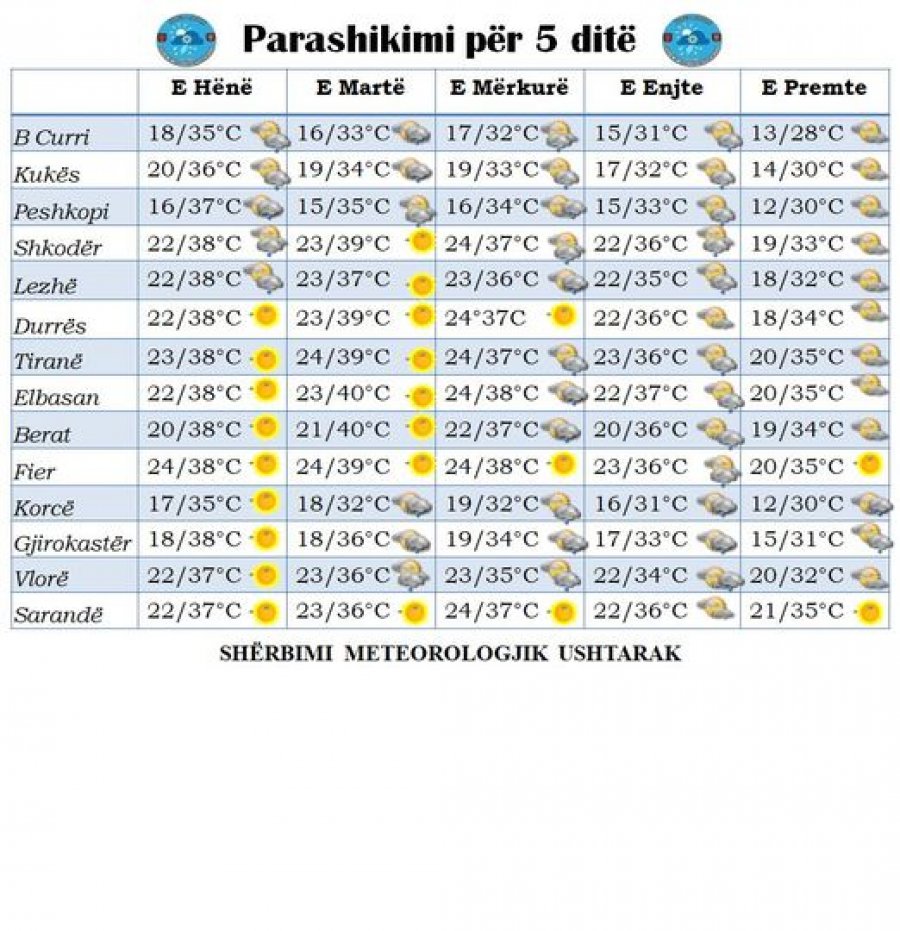 ‘Javën që vjen vendi ynë do të ndikohet nga kushte atmosferike relativisht të paqëndrueshme dhe pak më të freskët, për shkak të tërheqes së Anticiklonit Afrikan dhe ai i Azoreve. Orët me diell nuk do të mungojnë. Moti pritet të jetë fillimisht i kthjellët si dhe vranësira në shtim nga orët e mesditës e pasdites kryesisht në relievet kodrinore – malore të vendit.