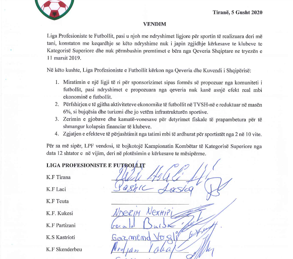 Nga dhjetë klubet pjesëmarrëse sezonin e ardhshëm në Superiligë vetëm përfaqësuesit e klubit të Teutës nuk kanë firmosur kërkesën e përbashkët të Ligës së Profesionistëve. Pasi mbyllën një sezon të vështirë në çdo aspekt, të goditur shumë financiarisht nga kriza që solli Covid-19, klubet e Superligës kërkojnë të nisin sezonin e ri sipas kushteve të tyre, në të kundërt bojkoti vazhdon.
