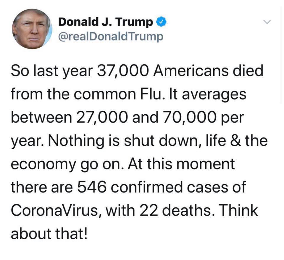 “Vitin e shkuar 37.000 amerikanë humbën jetën nga gripi i zakonshëm. Mesatarja vjetore e vdekjeve nga gripi (SHBA) është mes 27.000 dhe 70.000 në vit. Asgjë nuk ndalet, jeta&ekonomia vazhdojnë. Në këtë moment janë konfirmuar 546 raste të Coronavirus dhe kanë humbur jetën 22 persona. Mendojeni pak!”