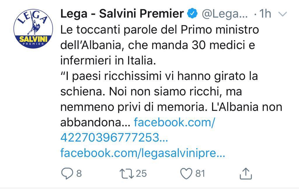 “Fjalët prekëse të kryeministrit të Shqipërisë, që dërgoi 30 mjeke e infermierë në Itali. “Vendet e pasura iu kthyen shpinën. Ne nuk jemi te pasur, por as të varfër nga kujtesa. Shqipëria nuk braktis kurrë mikun e saj në nevojë. Italia do ta fitojë këtë luftë “. 👏🏻👏🏻👏🏻 . ..”, shkruhet ndër të tjera në profilin zyrtar.