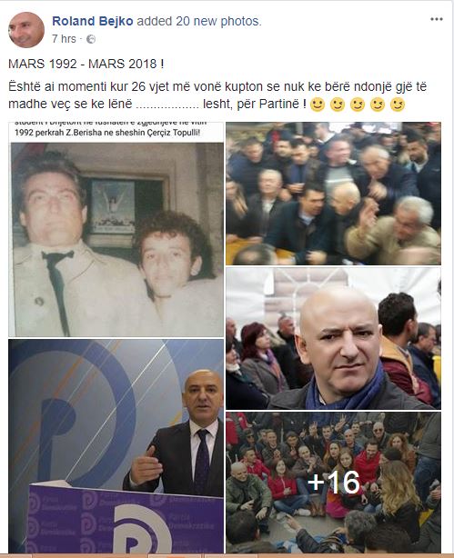 Kreu i PD Gjirokastër, Roland Bejko, ka kujtuar 22 marsin e vitit 1992, ditë kur u mbajtën zgjedhjet e para pluraliste në Shqipëri. Përmes një postimi në Facebook, ai tregon edhe një foto të hershme të tij, teksa shkruan me humor se sot pas 26 vitesh ka kuptuar se për partinë ka lënë flokët… Bejko ka kandiduar tre herë për t’u zgjedhur deputet. Fillimisht në vitin 2001, më pas në vitin 2013 dhe së fundi në vitin 2017. Gjatë qeverisjes së PD-së ai ka mbajtur funksione të ndryshme shtetëtore.