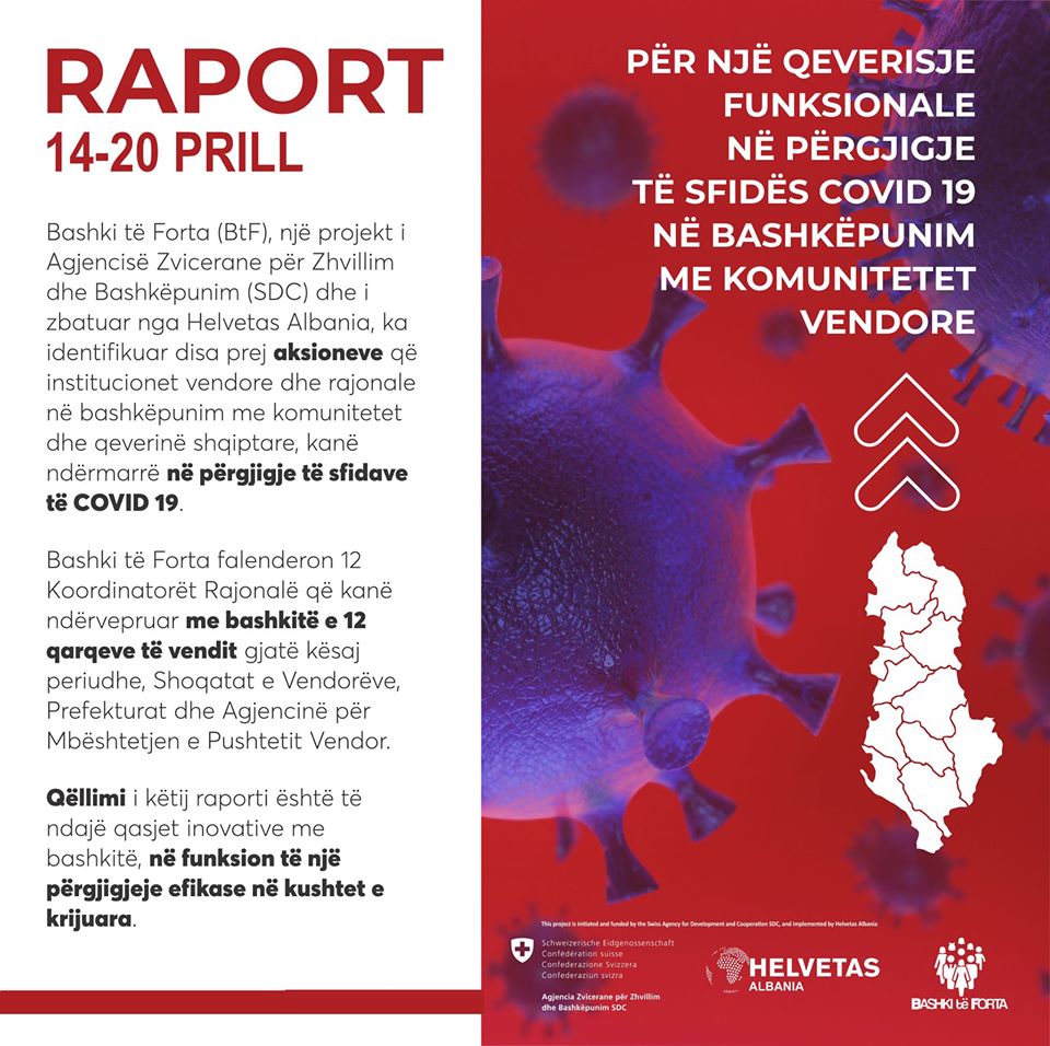 Projekti “Bashki të Forta” (BtF) nga Agjencia Zvicerane për Zhvillim dhe Bashkëpunim (SDC) dhe zbatuar nga Helvetas Swiss Intercooperation, ka identifikuar disa prej aksioneve që institucionet vendore dhe rajonale në bashkëpunim me komunitetet dhe qeverinë shqiptare, kanë ndërmarrë në përgjigje të sfidave të COVID 19. 12 Koordinatorët Rajonalë të “Bashki të Forta”, kanë ndërvepruar me të 61 Bashkitë gjatë kësaj periudhe si dhe Shoqatat e Vendorëve, Prefekturat dhe Agjencinë për Mbështetjen e Pushtetit Vendor. Qëllimi i këtij raporti javor (fillimisht i ndërmarrë në mbulim të një grupi bashkish) dhe në javët në vijim është të ndajë qasjet inovative me Bashkitë, në funksion të një përgjigjeje efikase në kushtet e krijuara. Linku më poshtë raporti për 14-20 Prill 2020.