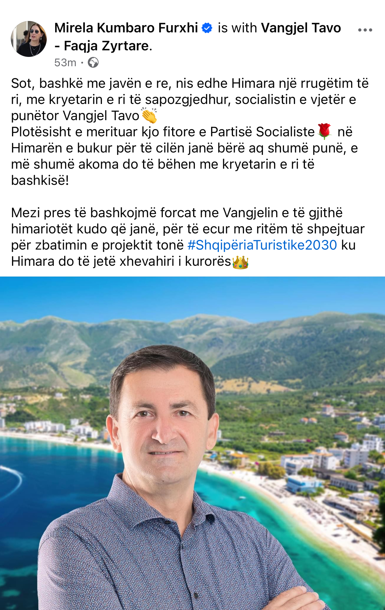“Sot, bashkë me javën e re, nis edhe Himara një rrugëtim të ri, me kryetarin e ri të sapozgjedhur, socialistin e vjetër e punëtor Vangjel Tavo. Plotësisht e merituar kjo fitore e Partisë Socialiste në Himarën e bukur për të cilën janë bërë aq shumë punë, e më shumë akoma do të bëhen me kryetarin e ri të bashkisë!