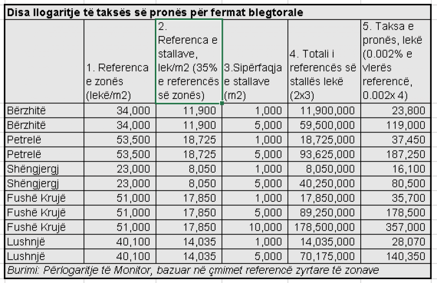 Ndërsa taksa e pronës së shtëpisë është 0.05% e referencës, taksa e stallës është 0.2% e referencës, pra katër herë më e lartë. Në varësi nga sipërfaqja dhe nga zona, pronari i ndërtesës së një ferme blegtorale do të paguajë nga rreth 150-200 euro në vit në zona me referencë të ulët të pronës dhe me sipërfaqe rreth 1000 m², në 3500 euro në vit për sipërfaqe të mëdha, mbi 10 mijë metra katrorë (shih tabelën).