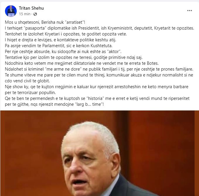 Deputeti i partisë demokratike Tritan Shehu ka reaguar pas vendimit të GJKKO për masën ‘detyrim paraqitje’ për Sali Berishën. Ai shkruan se me tërheqjen e pasaportës diplomatike të ish Presidentit, ish Kryeministrit po tentohet të izolohet kryetari i opozitës, të goditet vetë opozita. Këto ndodhira sipas tij ndodhin vetëm në regjimet diktatoriale dhe në vendet më të errëta të botës.
