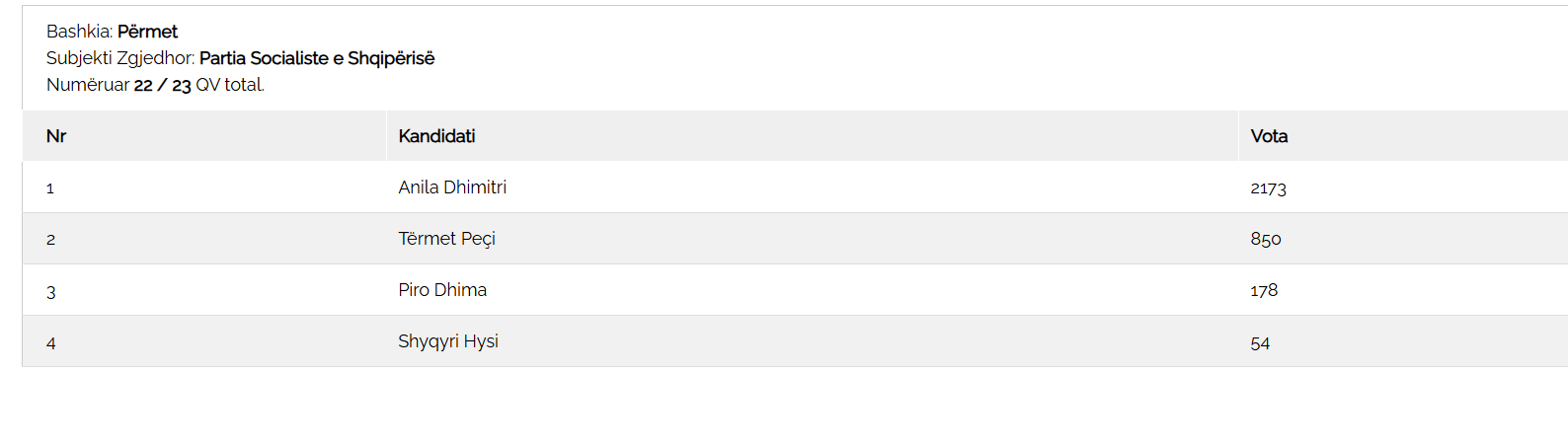 Anila Dhimitri në listën e hapur të PS-së ka marrë shumicën e votave në Bashkinë Përmet. Plot 2173 vota ishin për të. I dyti me 870 vota është renditur Tërmet Peci, i treti Piro Dhima me 178 dhe në vendin e fundit Shyqyri Hysi me 54 vota. Sa i përket listës së hapur të PD-së, renditja është kjo: Bajram Hysa 582, Arben Ristani 355, Alma Kore 13 dhe Mariklent Dervishi 77. Shihni tabelat më poshtë.