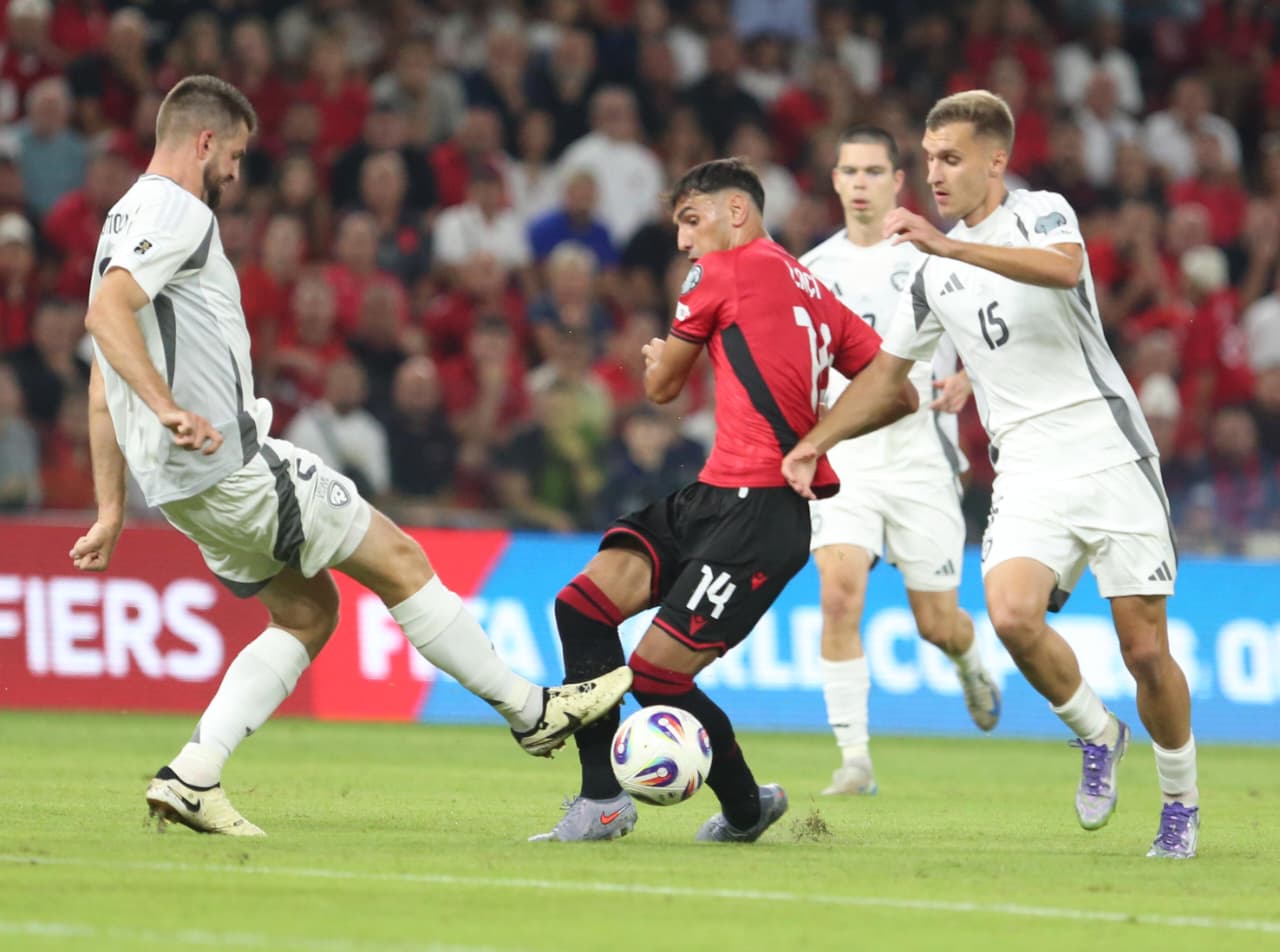 24- Shqipëria fiton penallti. Laçi futi topin në zonë dhe pas një prekje me dorë, arbitri akordoi 11-metërsh.
