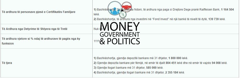 Bashkëshortja, Znj. Vjolanda Ndoni, të ardhura nga paga si Drejtore Dege pranë Raiffeisen Bank, 1 164 504 lekë.