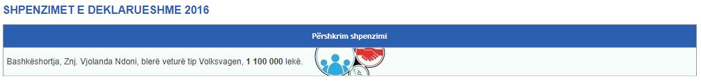 Përsa i përket shpenzimeve të deklaruara gjatë 2016, Ndoni thotë se bashkëshortja e tij Znj. Vjolanda Ndoni, ka blerë veturë tip Volksvagen, 1 100 000 lekë.