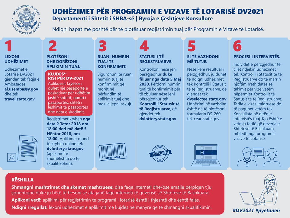 Ndërkohë që kanë nisur që dje regjistrimet për Programin e Lotarisë DV-2021, Ambasada Amerikane ka nxjerrë udhëzimet për të gjithë ata që janë të interesuar të aplikojnë.