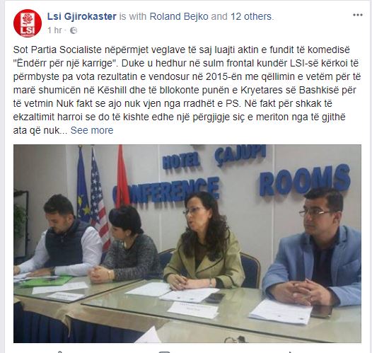 Sot Partia Socialiste nëpërmjet veglave të saj luajti aktin e fundit të komedisë “Ëndërr për një karrige”. Duke u hedhur në sulm frontal kundër LSI-së kërkoi të përmbyste pa vota rezultatin e vendosur në 2015-ën me qëllimin e vetëm për të marë shumicën në Këshill dhe të bllokonte punën e Kryetares së Bashkisë për të vetmin Nuk fakt se ajo nuk vjen nga rradhët e PS. Në fakt për shkak të ekzaltimit harroi se do të kishte edhe një përgjigje siç e meriton nga të gjithë ata që nuk e vlerësojnë si të ndershme shit-blerjen e këshilltarëve. Hynë në mbledhje me 14 këshilltarë e gjysëm, një kryetar dhe dy nenkryetarë dhe dolën me 15 këshilltarë, pra përfituan vetëm gjysëm këshilltari dhe i humbën gjithë të tjerat. Partia Socialiste e Gjirokastrës nuk heq dorë nga presionet dhe blerjet e votave por duhet ta dinë se këto forma janë të provuara dhe jo vetëm që nuk japin rezultat por kostoja që do të marin është tepër e madhe dhe rezultatet kanë filluar të duken. Ne përsërisim thirrjen që të heqin dorë menjëherë nga këto forma të ulëta dhe në vend që të gjuajnë se cilin këshilltar do blejnë të mendojnë si do ti shërbejnë atyre që i kanë votuar. LSI është e vendosur tē vazhdojë në rrugën që ka premtuar dhe këshilltarët e saj do të jenë deri në fund të mandatit në shërbim të qytetarëve dhe të Gjirokastrës.