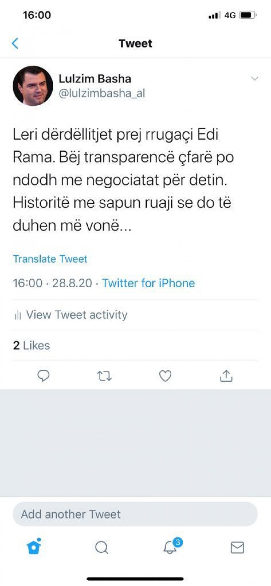 Basha i përgjigjet Ramës në Twitter: Leri dërdëllitjet prej rrugaçi Edi Rama. Bëj transparencë çfarë po ndodh me negociatat për detin. Historitë me sapun ruaji se do të duhen më vonë…