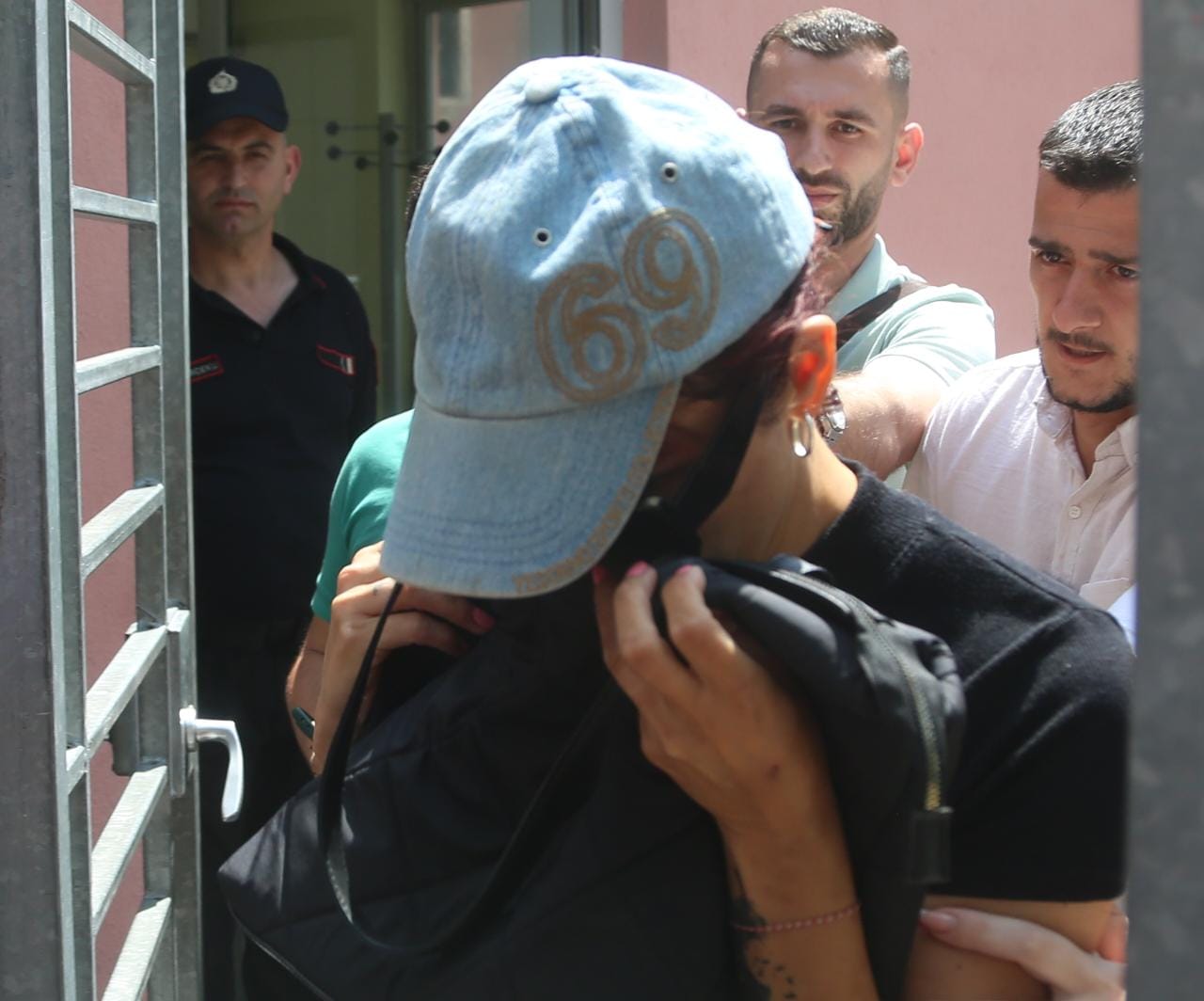 E veshur sportive me bluzë të zezë dhe pantallona me kuadrate dhe një kapele xhinsi me numrin 69. Edhe në hyrje ajo u përpoq t’i shmangte kamerat duke mos i lejuar ta filmonin duke vendosur çantën para.