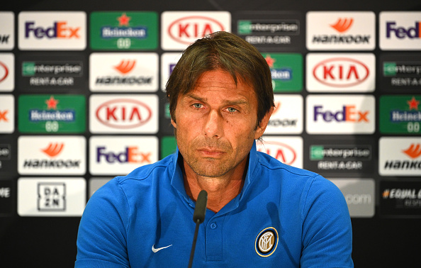 DUESSELDORF, GERMANY – AUGUST 09: In this handout image provided by UEFA Antonio Conte, Manager of Inter Milan speaks to the media during a press conference ahead of their UEFA Europa League Quarter Final match against Bayer 04 Leverkusen at Merkur Spiel-Arena on August 09, 2020 in Duesseldorf, Germany. (Photo by UEFA – Handout/UEFA via Getty Images)