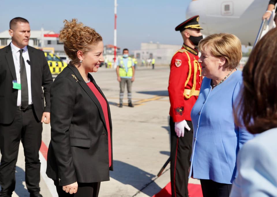 “Nder dhe kënaqësi t’i uroja mirëseardhjen Kancelares Gjermane, Angela Merkel, e cila mbërriti në Tiranë për takime të rëndësishme me Kryeministrin Edi Rama dhe liderët e rajonit. Mirënjohje për mbështetjen e saj për integrimin 🇪🇺 të Ballkanit Perëndimor si dhe për forcimin e bashkëpunimit dhe zhvillimin e rajonit tonë. 🇦🇱🤝🇩🇪”