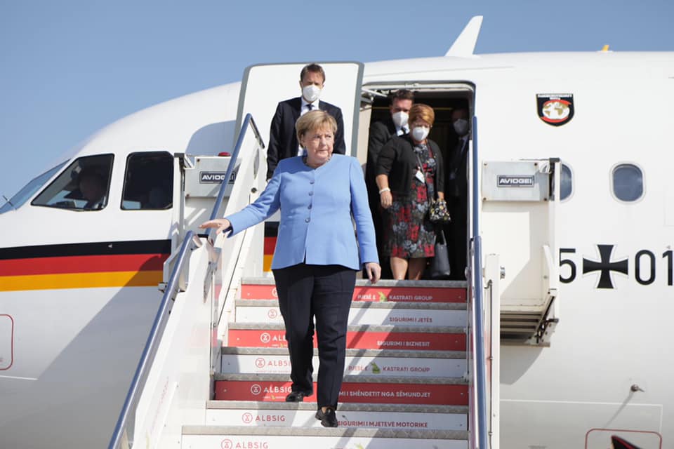 Kancelarja gjermane Angela Merkel ka mbërritur në Rinas. Ministrja për Europën e Punët e Jashtme Olta Xhacka i ka uruar mirëseardhjen, teksa në aeroport kanë dalë dhe diplomatë europianë.