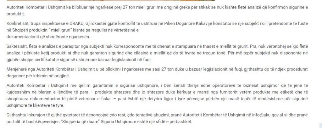 Sikundër AKU bën publik emrin e një tregtari mishi që shet jashtë kushteve higjeno-sanitare, ka detyrimin të informojë konsumatorët edhe për subjektin që fut në Shqipëri 27 ton miell pa çertifikatë që konfirmon sigurinë e produktit. Më poshtë dy njoftimet e AKU Gjirokastër. I pari për miellin e bllokuar në Kakavijë, ku mungon emri i subjektit. I dyti, për dyqanin e bllokuar në Gjirokastër, ku jepet emri i subjektit.
