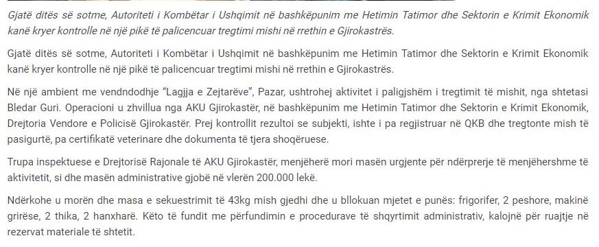 Kush është tregtari apo kompania, për llogari të së cilës u bllokua kjo sasi kaq e madhe? Pse AKU Gjirokastër zgjedh ta mbajë sekret emrin e këtij subjekti, kur nuk vepron kështu në raste të tjera? Ju kujtojmë në rastet kur bllokohen pika të therjes dhe tregtimit të mishit jashtë standardeve, AKU bën publik emrin e subjektit, si dhe gjobën, nëse është vendosur një e tillë. Për shembull para disa kohësh u bllokua një dyqan mishi në lagjen ‘Pazar’ të Gjirokastrës.