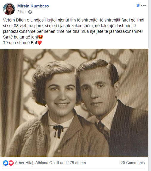 “Vetëm Ditën e Lindjes i kujtoj njeriut tim të shtrenjtë, të shtrenjtit fare! që lindi si sot 88 vjet me pare, si njeri i jashtezakonshëm, që falë një dashurie të jashtëzakonshme për nënën time më dha mua një jetë të jashtëzakonshme! Sa të bukur që jeni😍 Të dua shumë Ba!♥️”, shkruan Kumbaro.