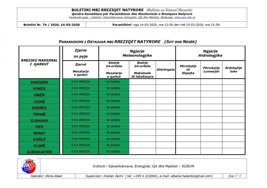 Instituti i Gjeoshkencave, Energjisë, Ujit dhe Mjedisit ka bërë parashikimin e motit për 24 orët e ardhshme.