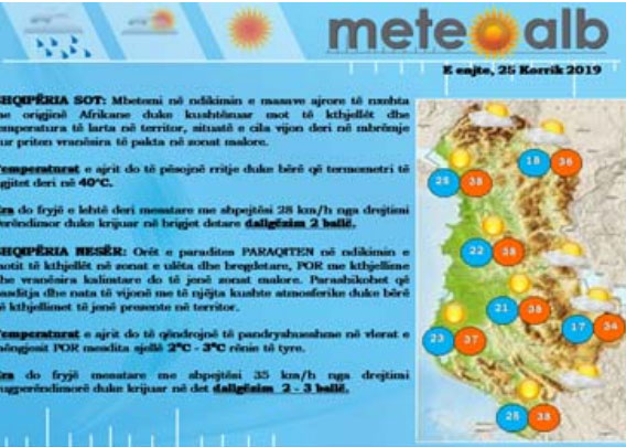 Dita e Enjte do të mbetet në ndikimin e masave ajrore të nxehta. Moti parashikohet me kthjellime dhe zhvillim vranësirash në mesditë, më të përqendruara në Jug e Juglindje të vendit. Era do të fryjë e lehtë e mesatare, me drejtim Veriperëndim-Juglindje, duke u shoqëruar me valëzim të forcës 2 ballë.