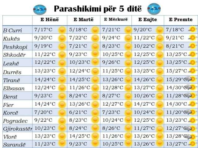“Java që presim përpara parashikohet një javë me “shije” vere pasi vendi ynë pritet të ndikohet nga kushtet të qëndrueshme atmosferike me plot orë me diell si dhe temperatura në rritje. Në këtë mënyrë siç u theksua edhe më lartë duke nisur nga dita e Hënë (nesër) deri dhe ditën e Enjte moti parashikohet i kthjellët në pjesën më të madhe të territorit”.