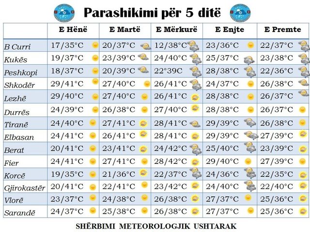 Për ditët: e Hënë, e Martë, e Mërkurë moti pritet të jetë i kthjellët e orë të plota me diell pa përjashtuar vranësirat të pakta kalimtare nga orët e mesditës kryesisht në relievet malore.