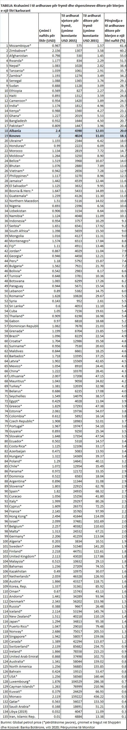 “Monitor” ka përllogatur shpenzimet ditore, që duhen për blerjen e një litri naftë për 135 shtete në botë, në raport me të ardhurat totale, bazuar në çmimet e naftës në dollarë sipas Global Petrol Price dhe të ardhurave për frymë në dollarë të publikuara nga Banka Botërore.
