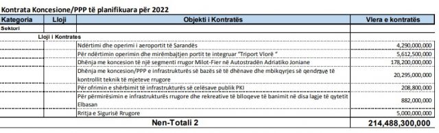 Koncesionet e parashikuara nga qeveria per miratim ne 2022