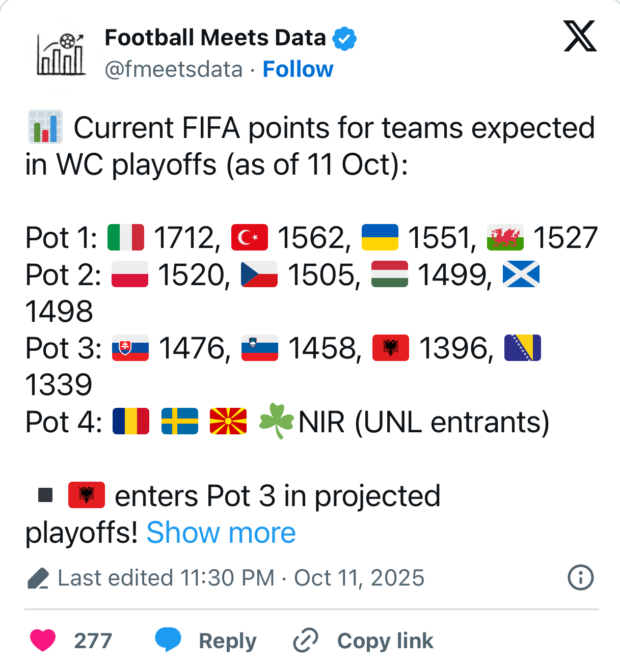 Në vazon e dytë janë Polonia, Çekia, Hungaria dhe Skocia. Situata është hipotetike, pasi në nëntor gjërat mund të ndryshojnë.