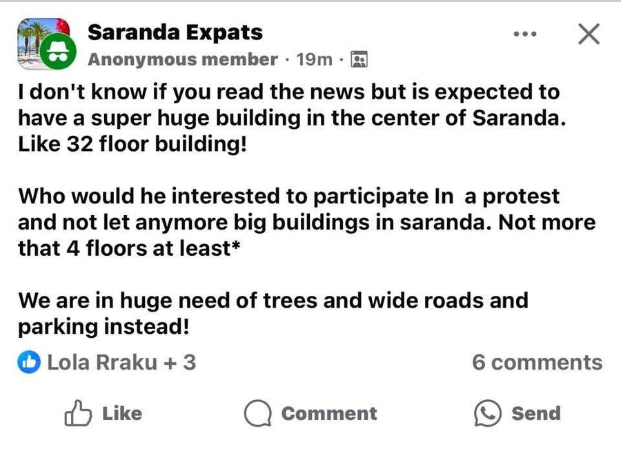 “Nuk e di nëse keni lexuar lajmet, por pritet të ndërtohet një ndërtesë shumë e madhe në qendër të Sarandës. Një ndërtese me 32 kate! Kush do të ishte i interesuar të marrë pjesë në një protestë dhe të mos lejojë më ndërtimin e ndërtesave të mëdha në Sarandë? Të paktën deri në 4 kate! Ne kemi nevojë urgjente për pemë, rrugë të gjera dhe parkingje në vend!, -shprehen të huajt në postim.