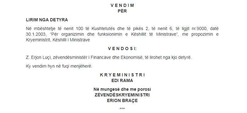 “Në mbështetje të nenit 100 të Kushtetutës dhe të pikës 2, të nenit 6, të ligjit nr.9000, datë 30.1.2003, “Për organizimin dhe funksionimin e Këshillit të Ministrave”, me propozimin e Kryeministrit, Këshilli i Ministrave vendosi Z. Erjon Luçi, zëvendësministër i Financave dhe Ekonomisë, të lirohet nga kjo detyrë. Ky vendim hyn në fuqi menjëherë.”