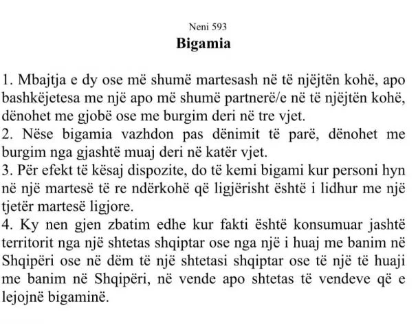Në projektligjin e hedhur për diskutim theksohet se: Mbajtja e dy ose më shumë martesash në të njëjtën kohë, apo bashkëjetesa me një apo më shumë partnerë/e në të njëjtën kohë, dënohet me gjobë ose me burgim deri në tre vjet. Nëse bigamia vazhdon pas dënimit të parë, dënohet me burgim nga gjashtë muaj deri në katër vjet.