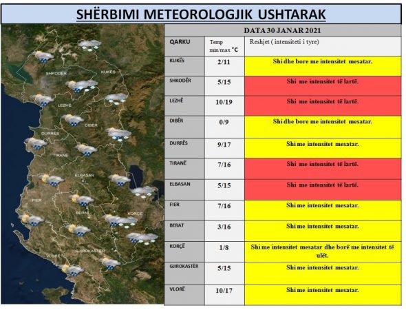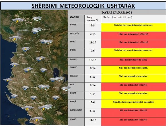 Në lartësinë mbi 600 metra në veri dhe në lartësinë mbi 900 metra në juglindje reshjet do të jenë në formën e dëborës. Kjo paqëndrueshmëri do të shoqërohet me erë nga kuadrati i jugut e cila do të ndikojë dhe në rritjen e temperaturave .