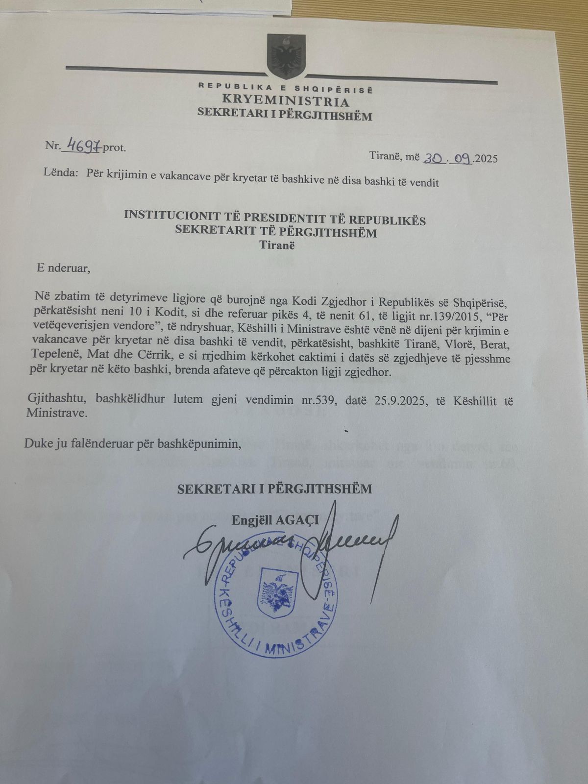 Vetëm 5 ditë pas shkarkimit të Erion Veliajt, Këshilli i Ministrave ka njoftuar zyrtarisht Presidentin Bajram Begaj për vakancën në Bashkinë e Tiranës. Në shkresën që mban datën 30 shtator, kryeministri Edi Rama njofton kreun e shtetit edhe për vakancat në 5 bashkitë e tjera të vendit, Vlora, Berati, Mati, Cerriku dhe Tepelena.
