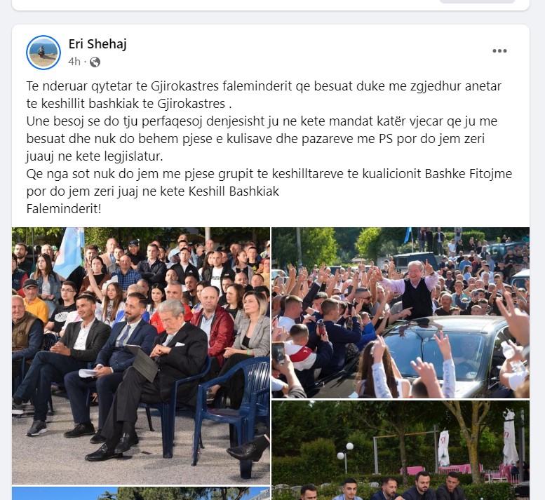“Une besoj se do tju perfaqesoj denjesisht ju ne kete mandat katër vjecar qe ju me besuat dhe nuk do behem pjese e kulisave dhe pazareve me PS por do jem zeri juauj ne kete legjislatur. Qe nga sot nuk do jem me pjese grupit te keshilltareve te kualicionit Bashke Fitojme por do jem zeri juaj ne kete Keshill Bashkiak”, shkruan Shehaj në Facebook.