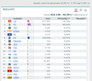 Numërohen 2793 nga 5362 kuti në rang kombëtar. Nga numërimi i më shumë se gjysmës së kutive, rezulton se Partia Socialiste ka 48,90% të votave, pra 73 mandate. PD 28,74%, 43 mandate, LSI 14,70%, 19 mandate, PDIU 14,70%, 4 mandate dhe PSD 0,72%, 1 mandat