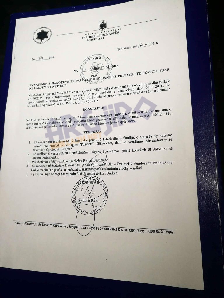 Në orët e vona të mbrēmjes Bashkia Gjirokastër ka marrë vendimin për të evakuuar 20 familjet që rrezikohen nga rrëshqitja e tokës në lagjen ‘Punëtori’. Sipas vendimit, një kopje të të cilit e sjell më poshtë ArgjiroLajm.net banorët do të vendosen te konvikti i Shkollës Pedagogjike. Për zbatimin e këtij vendimi Bashkia Gjirokastër kërkon edhe mbështetje e Drejtorisë Vendore të Policisë. Që sonte policia ka shkuar për të larguar banorët nga pallati, por ka ndeshur edhe refuzimin e disa prej tyre. Ata nuk pranojnë të largohen nga shtëpitë. Pritet që ditën e martë të dalë raporti përfundimtar i Shërbimit të Gjeologjisë, i cili do të vendosë se çfarë do të bëhet me këtë objekt.