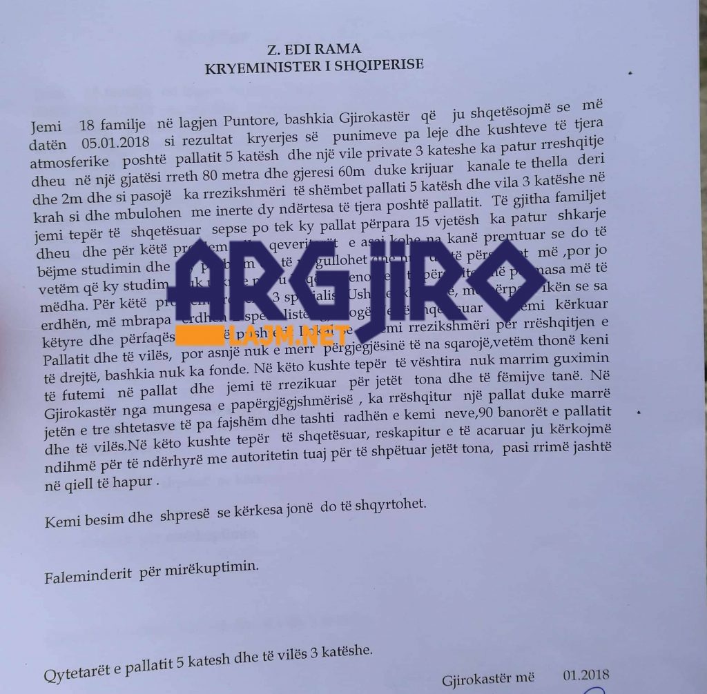 Në një peticion drejtuar kryeministrit Edi Rama, 90 banorët e rrezikuar nga rrëshqitja e tokës në lagjen “Punëtore” në Gjirokastër të rraskapitur, të shqetësuar dhe të acaruar kërkojnë ndihmë dhe mbështetje institucionale. Edhe pse janë rikthyer në banesat e tyre ata jetojnë me frikën që do të sjellë e nesërmja, ndërsa rrëshqitjet e tokës janë të vazhdueshme. Pamjet janë të frikshme, gati sureale. Sipas banorëve rrëshqitjet e tokës kanë nisur pikërisht pasi në kodër, aty ku është edhe pallati i tyre, po ndërtohet një tjetër ndërtesë, nga e cila rrezikon të shembet i gjithë pallati. Një ditë më parë policia e Gjirokastrës referoi në prokurori materialet për ndërtim pa leje të pronarëve të godinës që kreu punimet, të cilat deri tani konsiderohen si përgjegjëse për rrëshqitjen e masivit të dheut kodrinor. Të alarmuar nga rrëshqitjet e dherave dhe nga lëkundjet që kanë ndjerë, 15 familje kanë braktisur pallatin ku jetonin. Ata kërkojnë ndërhyrjen e kryeministrit për t’i dhënë zgjidhje situatës që sipas tyre nuk e merr përsipër asnjë autoritet.